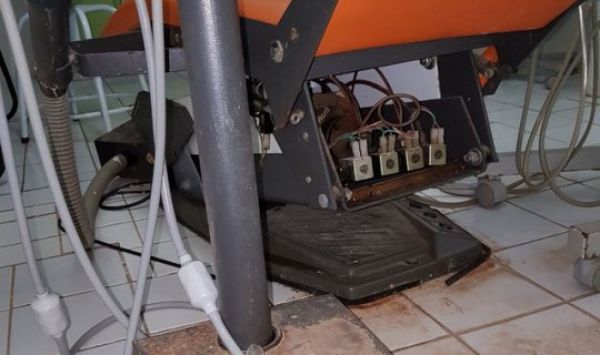 Cadeira odontológica danificada e com fiação elétrica exposta, ferrugem no mobiliário, torneiras inadequadas e infiltrações nas paredes