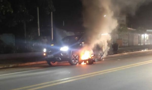 Câmeras de segurança flagraram o momento em que o carro passava com a moto em chamas.