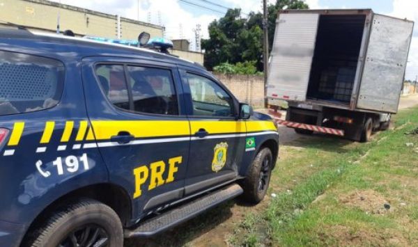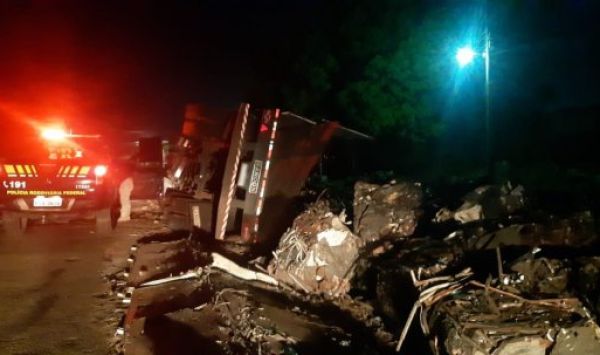 O veículo de carga seguia na BR 222 quando, no cruzamento com a BR 343, na rotatória de acesso, saiu da pista e tombou.