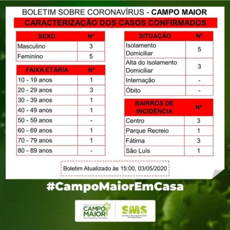 A Secretaria |Municipal de Saúde de Campo Maior divulgou novo boletim sobre o coronavírus na tarde deste domingo (03/05). Mais um caso da doença foi confirmado. É o oitavo caso. O paciente é do sexo feminino e mora no centro da cidade.