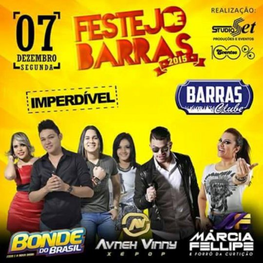 No sábado, dia 05, o Barras Clube recebe a banda Desejo de Menina e Double Deck, domingo, dia 06, Aviões do Forró e Washington Brasileiro e na segunda-feira, dia 07, tem Bonde do Brasil, Xé Pop e Marcia Felipe.