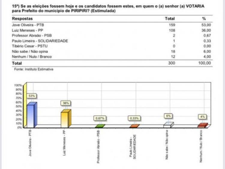 A pesquisa realizada pelo Instituto Estimativa no município de Piripiri aponta a candidata a prefeita Jove Oliveira em primeiro lugar na corrida pela prefeitura do município. O levantamento estimulado mostra Jove com 53% das intenções de voto. Em segundo lugar vem o atual prefeito Luís Meneses (PP) com 36%. Logo depois vem Professor Abraão (PSB) com 0,67%, Paulo Limeira (Solidariedade) com 0,33%. Não sabe/não opina são 6%. Nenhum, branco ou nulo somam 4%.