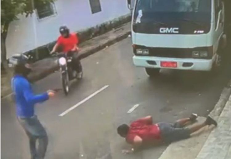 Dois homens armados estavam em uma motocicleta, quando um desceu para fazer a abordagem. A imagem da câmera de segurança mostrou que o policial, que estava armado, correu ao perceber que seria abordado, mas ele acabou tropeçando e caiu no chão. Ele se levantou, mas caiu novamente.