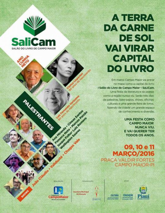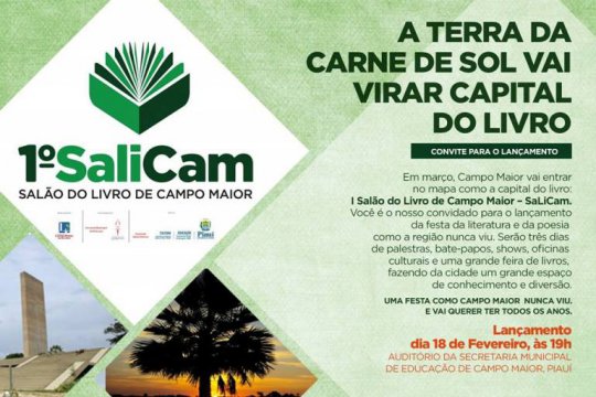 Campo Maior estará definitivamente entrando no círculo cultural do Piauí, com a realização do 1º Salão do Livro de Campo Maior (SALICAM), cujo lançamento ocorrerá nesta quinta-feira (18/02), às 19 horas, no auditório da Secretaria de Educação de Campo Maior.