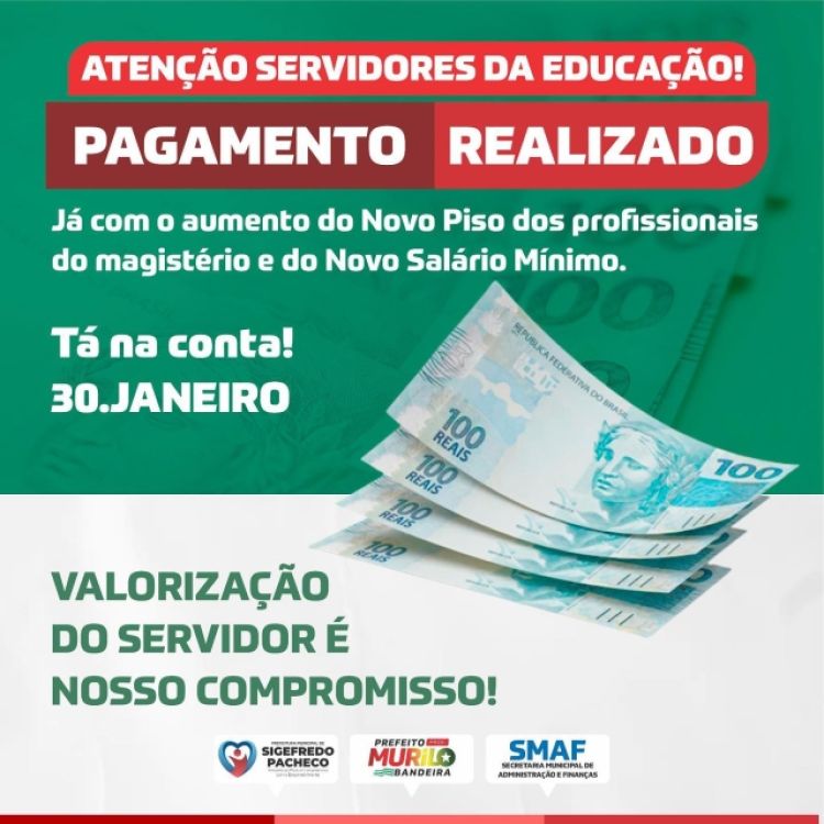 "Mais um compromisso nosso sendo mantido ao longo desses dois anos de mandato. Pagamos hoje o salário dos servidores da educação já com o novo piso salarial do magistério e para os demais servidores da educação também pagamos com o novo valor do salário mínimo nacional. Isso, além de aquecer a economia local, garante ainda a valorização de nossos servidores. Seguimos firmes no compromisso de administrar respeitando a cada de nossos servidores", disse o gestor.