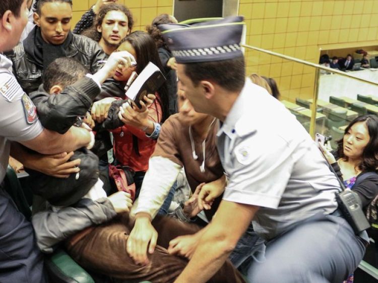 Cerca de 250 pessoas conseguiram entrar no local, mas um grupo de estudantes ficou do lado de fora e tentou forçar a entrada, mas foi impedido por policiais militares que faziam a segurança do prédio no momento do protesto.