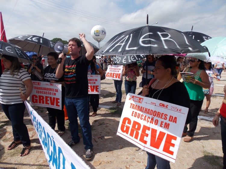 “Ão, Ão, Ão chegou o enrolão”. Com essas palavras o governador Wellington Dias (PT) foi recepcionado por um grupo de professores da rede estadual de ensino na manhã deste domingo (13/03) na cidade de Campo Maior, durante as comemorações dos 193 anos da Batalha do Jenipapo. Os grevistas acompanharam a solenidade com faixas, palavras de ordem e vaias.