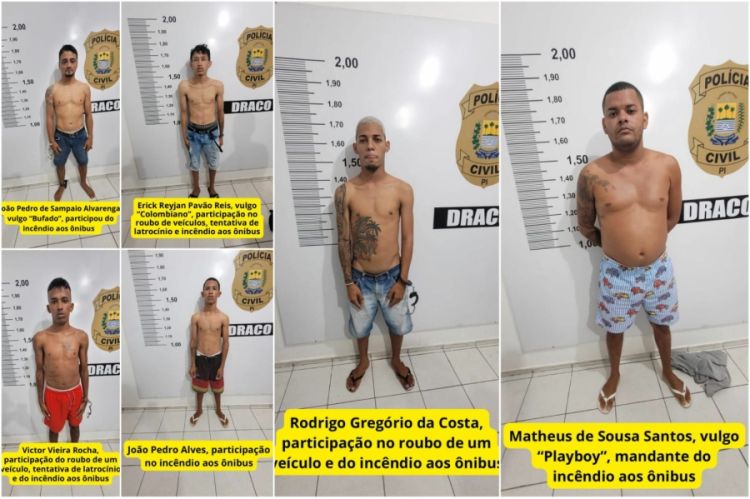 A Secretaria de Segurança do Piauí (SSP-PI) divulgou fotos de seis homens presos acusados de atear fogo contra ônibus em Teresina em retaliação a uma operação da Polícia Militar na Vila Mocambinho, zona Norte de Teresina, nesta segunda-feira (17/04). As prisões aconteceram nesta terça-feira (18/04), durante operação das forças de segurança na capital.