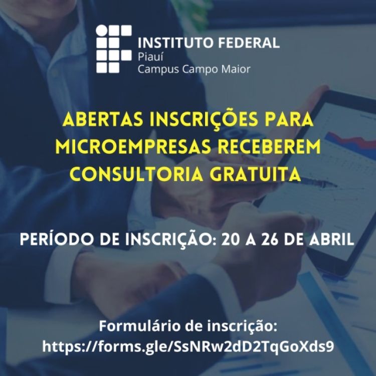 Campus Campo Maior abre inscrições para Microempresas receberem consultoria empresarial gratuita, através do projeto “S.O.S. Microempresa”. Trata-se de um projeto de extensão da turma do módulo IX do curso Bacharelado em Administração do IFPI Campus Campo Maior, sob a coordenação da Profª Esp. Plácida Jôaci Vima Pereira Soares.