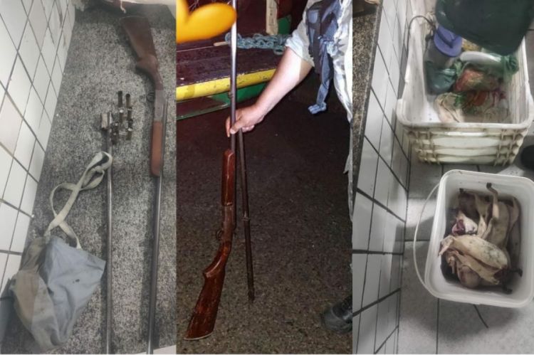 No veículo, os policiais avistaram um caixote branco, do tipo de feira, e a espingarda. Em revista, foram encontrados, além da arma e dos animais abatidos, oito cartuchos de munição, sendo seis intactos e dois deflagrados.