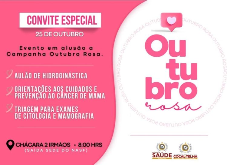 A prefeitura municipal de Cocal de Telha faz convite para o evento em alusão a Campanha Outubro Rosa que conterá na chácara 2 irmãos, as 8:00h. A saída será na sede do NAFS em Cocal de Telha.