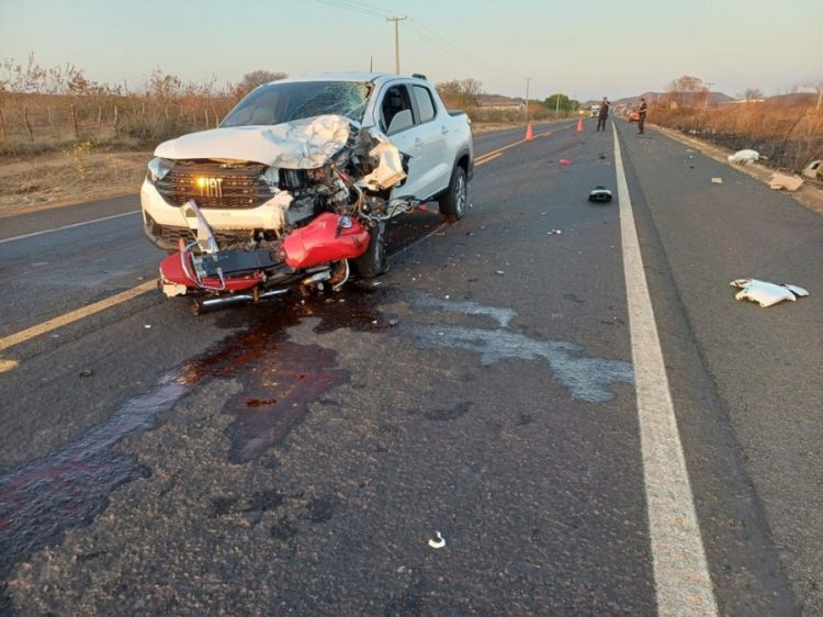 O acidente foi registrado por volta das 3h40 da madrugada entre uma picape e uma motocicleta. A PRF informou que o condutor do carro, de 74 anos, teria realizado uma ultrapassagem proibida, batendo de frente com a moto.