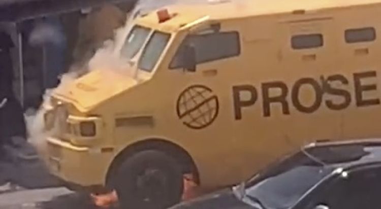 Além disso, um outro carro forte se encontra neste momento no local, onde está sendo feita a transferência de dinheiro de um veículo para outro.