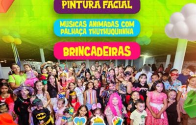 A agenda inclui atividades recreativas e culturais, com apresentação da Palhaça Thuthuquiinha, pintura facial e brincadeiras ao longo da manhã.