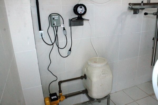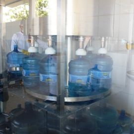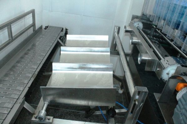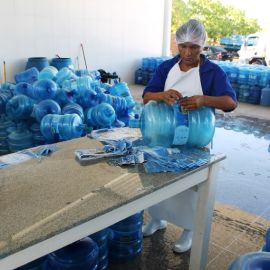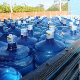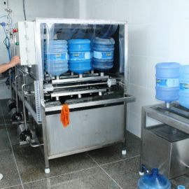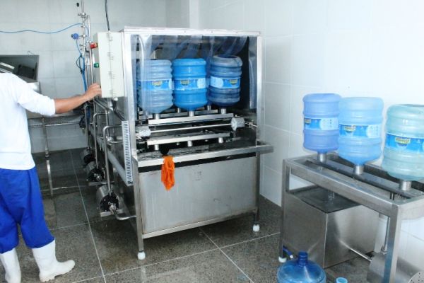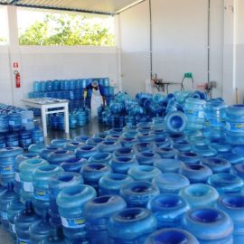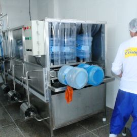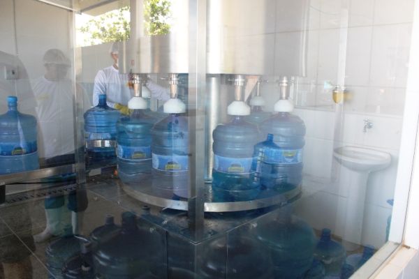 No galpão acontece a inspeção de todos os vasilhames que chegam e a rotulagem. Em seguida os galões passam por uma pré-lavagem e depois pela lavagem automatizada onde acontece a assepsia a fim de manter o grau de pureza do produto. Antes de ser envasado é feita a degerminação, que é a remoção mecânica dos microrganismos do vasilhame através da luz ultra violeta.