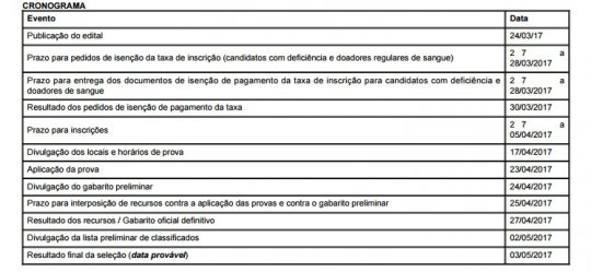 O processo seletivo acontece em apenas uma etapa: prova contendo 50 quest?es de portugu?s, Legisla??o do Minist?rio P?blico, No??es de Inform?tica e Conhecimentos espec?ficos. As provas ser?o aplicadas no dia 23 de abril de 2017, ?s 09:00 horas, nas cidades de Teresina, Campo Maior Piripiri, Parna?ba, Picos, Floriano, Bom Jesus, Oeiras e Corrente em local a ser divulgado no s?tio do Minist?rio P?blico. O resultado final ser? divulgado dia 3 de junho.?