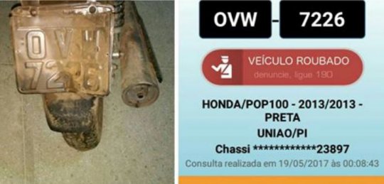 A moto tem registro de roubo junto ao Sistema Nacional de Informações de Segurança Pública, Prisionais e sobre Drogas (Sinesp) e estava abandonada no Bairro Cidade Nova, na saída de Campo Maior para quem segue para cidade de Coivaras-PI.