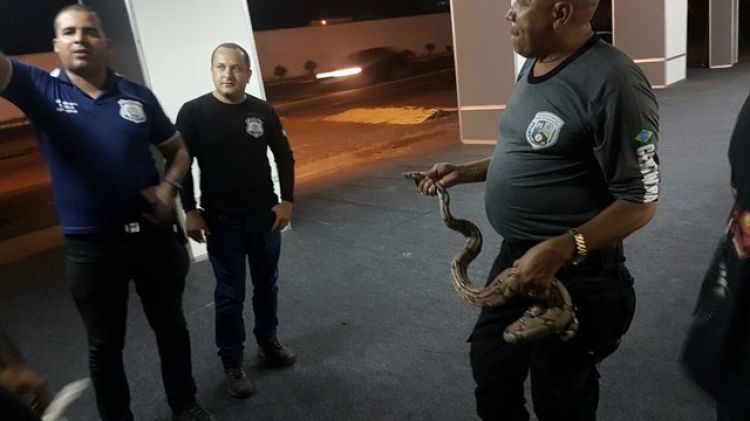 De acordo com a Secretaria de Segurança a cobra foi encontrada e colocada em um saco plástico para ser entregue aos policiais, que confirmaram não ser venenosa. “É uma jiboia. Apesar de não ser venenosa é preciso tomar todos os cuidados. Este período com os dias mais quentes e sem chuvas sapos, cobras e escorpiões saem em busca de alimento”, disse o cabo Mota, policial militar que recebeu o animal das mãos do homem que encontrou a cobra.