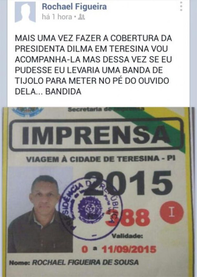 Em Teresina duas postagens chamaram atenção, a de um cinegrafista da TV Assembleia, que em sua rede social facebook postou foto de sua credencial para fazer a cobertura jornalística do evento juntamente com um texto onde relatava a vontade de agredir a presidenta. Outra postagem que ganhou destaque nacional foi a de uma das funcionárias do buffet que serviu toda a comitiva de Dilma. Em seu post ela pediu sugestões a seus amigos na rede de que “pedido especial” a presidente merecia. Esse questionamento gerou uma série de agressões verbais a presidente, inclusive foi sugerido que se servisse veneno.