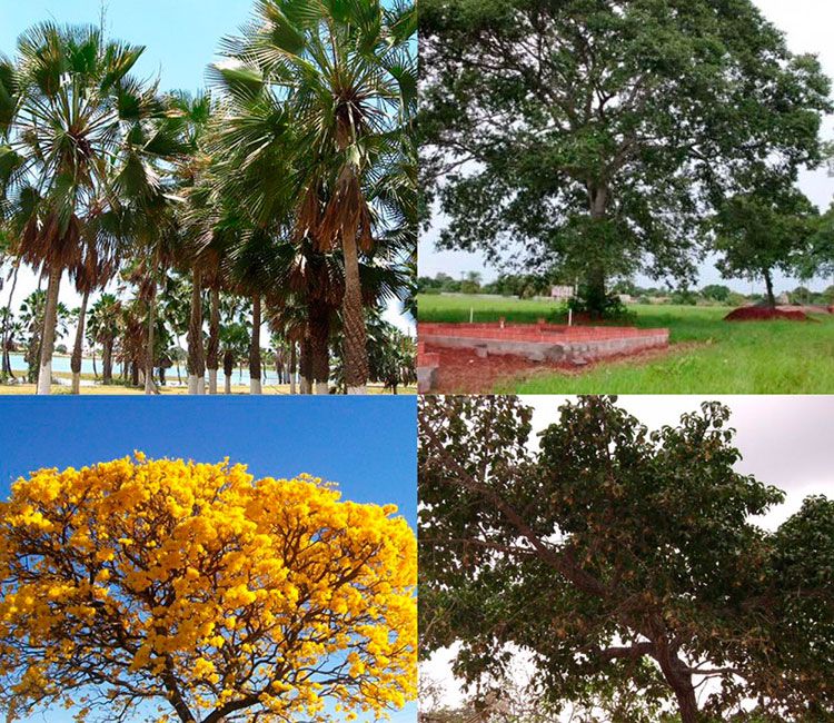 Carnaúba (Copernicia prunifera) – Planta perene, heliófila com um tronco simples, ereto, com numerosas folhas no seu topo. Usada na arborização e paisagismo, em construções e fornece cera.