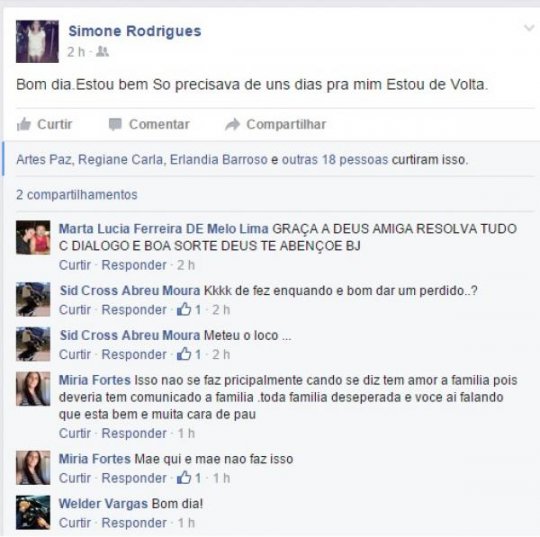 Desaparecida h? cerca de 08 dias, a Professora Simone Rodrigues Cunha, de 35 anos, resolveu dar?sinal de vida. Ela reativou seu perfil no facebook e mandou um recado para fam?lia e amigos na manh? desta sexta-feira (02).