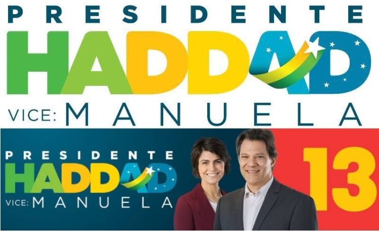 Na foto oficial, Haddad e sua vice, Manuela D'Ávila (PC do B), usam blazer. Ele, azul. Ela, bordô. Em azul, está a inscrição "Todos pelo Brasil". Figura central no primeiro turno, Lula não aparece mais.