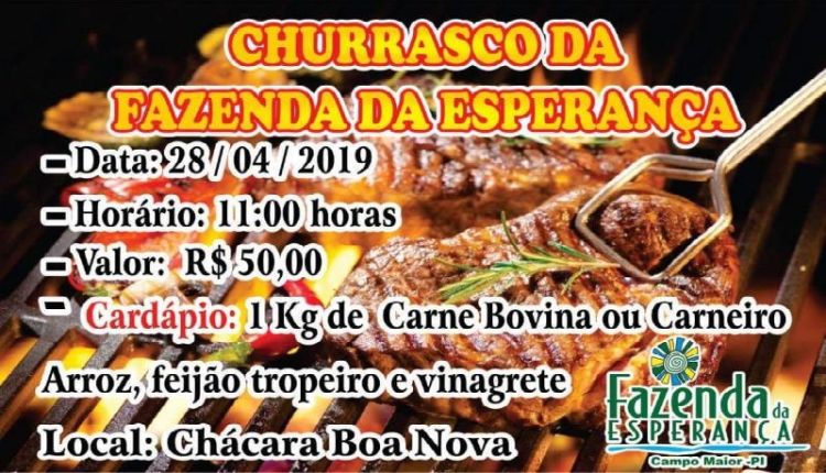 A Fazenda Esperança de Campo Maior vai realizar um churrasco para arrecadar fundos para o projeto da comunidade terapêutica da Fazenda. O evento acontece nesse domingo (28/04) na Chácara Boa Nova, na sápida de Campo Maior com destino à cidade de Coivaras.