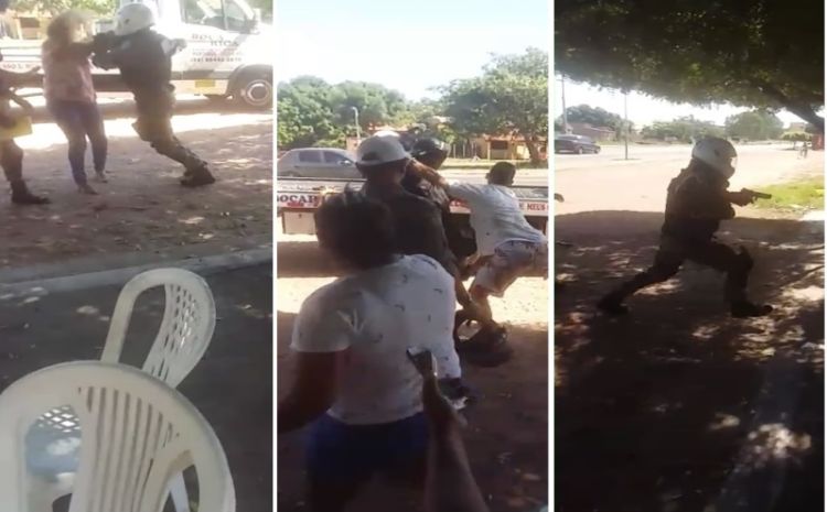 A mulher que aparece no vídeo sendo agredida pelo policial e a comerciante Rosangela Maria Sousa. Ela contou ao Em Foco que estava trabalhando em sua farmácia quando soube que a PM estava apreendendo uma motocicleta da família, que estava estacionada na calçada da sua residência.