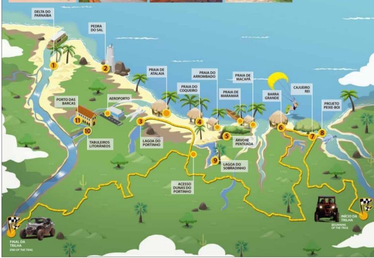 A trilha passará por importantes pontos como Projeto Peixe-Boi, Cajueiro Rei, Barra Grande, Lagoa do Portinho, Dunas do Portinho e Tabuleiros Litorâneos. O turista também terá a opção de conhecer a Praia de Macapá, Maramar, Arrombado, Coqueiro, Lagoa do Sobradinho, Praia da Pedra do Sal, Porto das Barcas e Delta do Parnaíba.