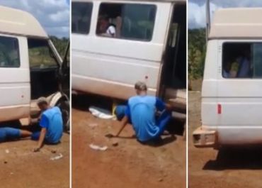 Aluno consertando van escolar para completar trajeto no interior do Piauí
